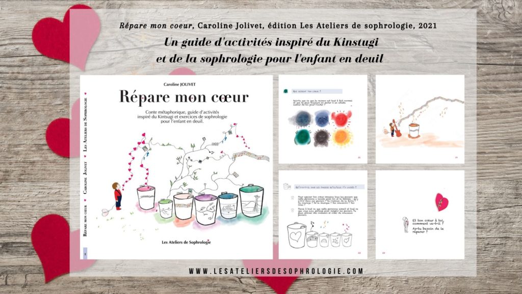 “Répare mon cœur” est une parabole du Kintsugi, la philosophie ancestrale, un art de résilience qui invite à embellir ses blessures et cicatrices en les raccommodant avec de la poudre d’or plutôt que de les cacher et un guide d’activités pour l’enfant en deuil.